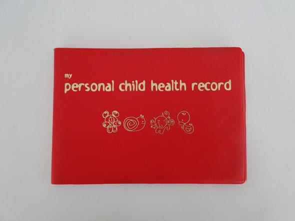 My health visitor also gave me a “Red Book” for each child. As you can see from the photo, it actually is a large red book called “My Personal Child Health Record.”